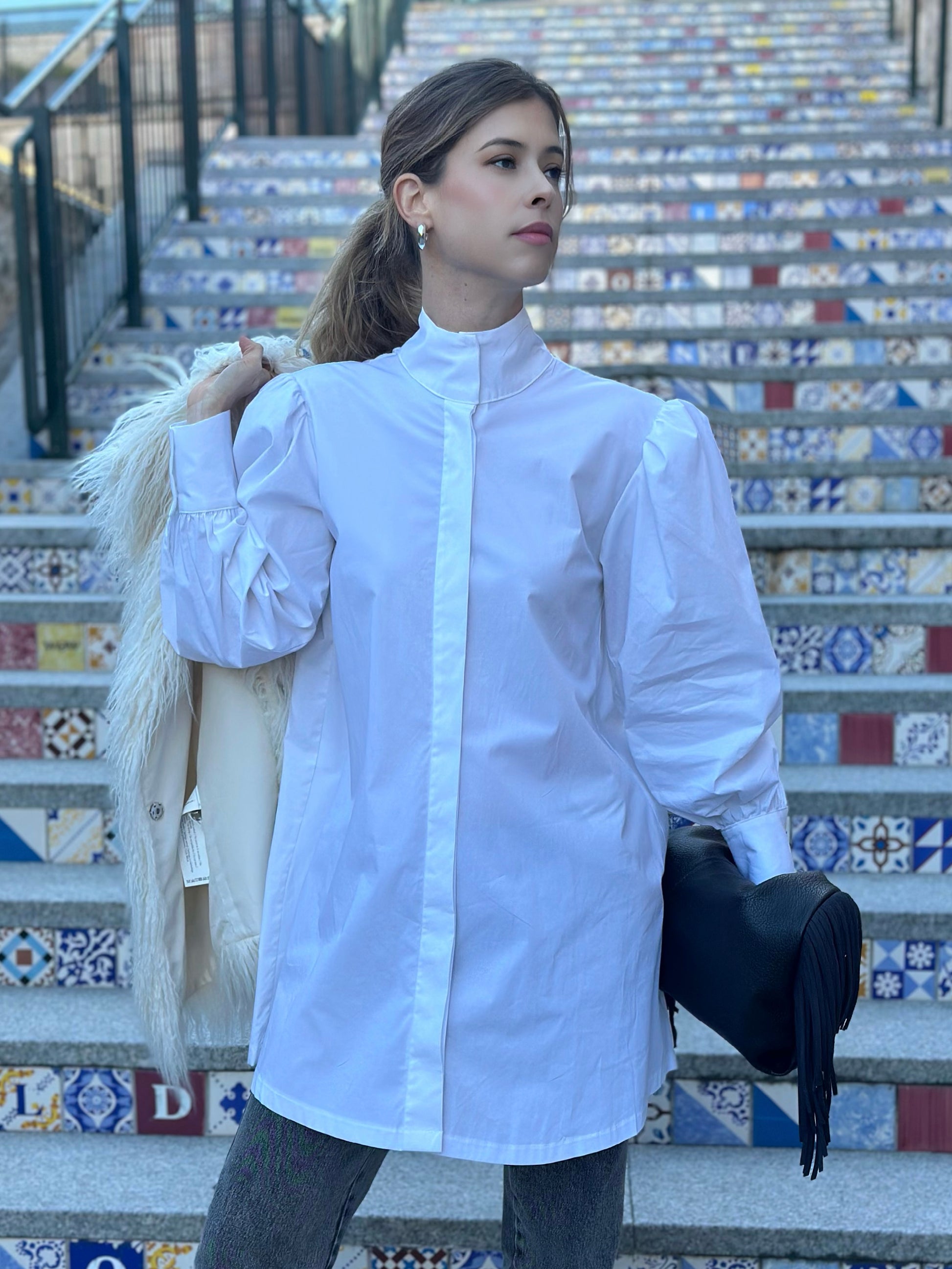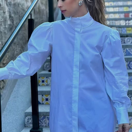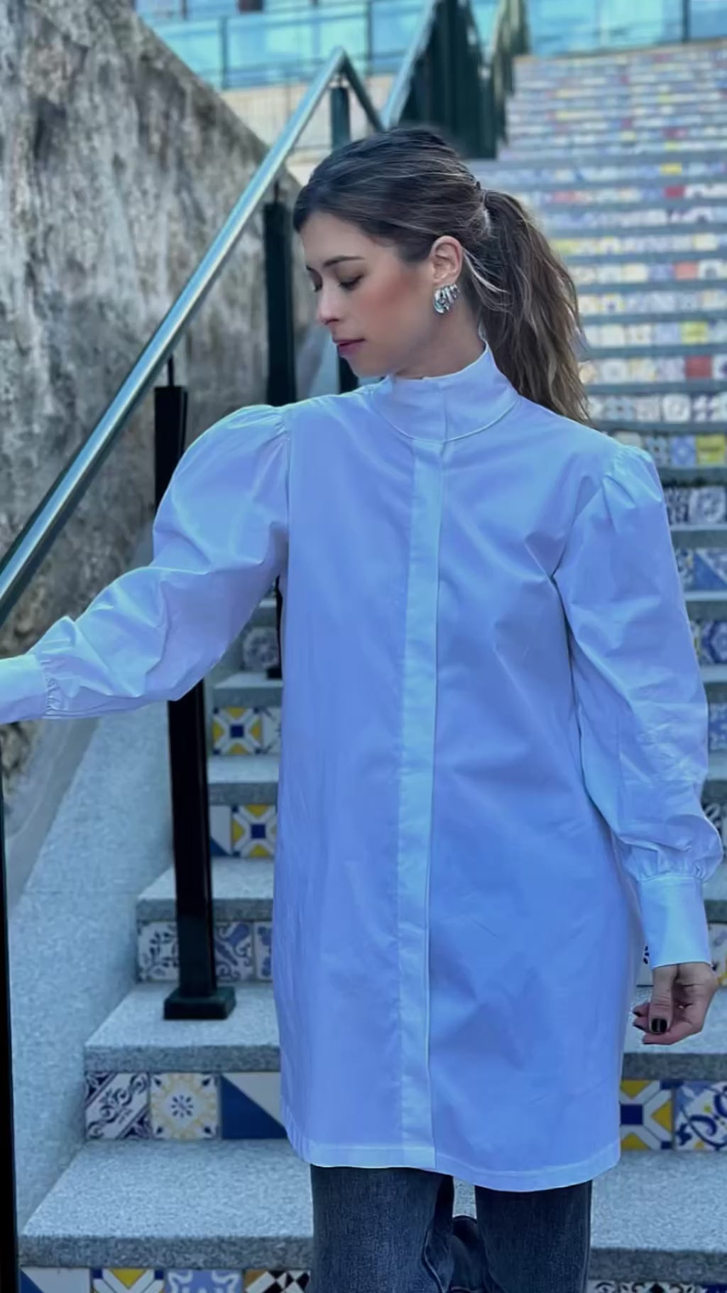 Uma silhueta limpa, quase arquitetónica, construída com a leveza da popeline.