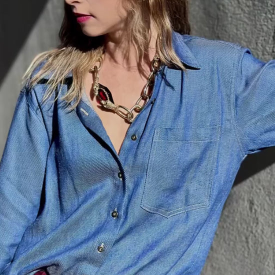 O corte ligeiramente oversize oferece versatilidade absoluta: pode ser usada como camisa, tunica ou sobreposição — adaptando-se ao ritmo do dia com naturalidade. Os detalhes minimalistas, o colarinho estruturado e a textura delicada elevam a peça sem lhe retirar simplicidade.